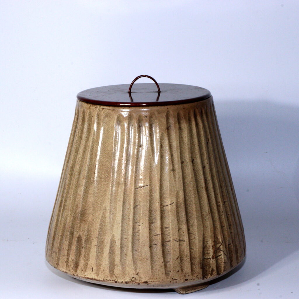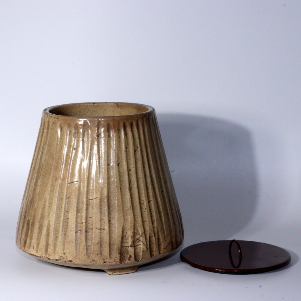 The mizusashi, a water jar, plays a central role in the tea ceremony as the container for fresh water, symbolizing purity and renewal. The carefully carved shinogi lines on this piece recall the ridges of a sword blade, adding rhythm and strength to its form, while the yellow glaze softens the overall impression with warmth and tranquility.
