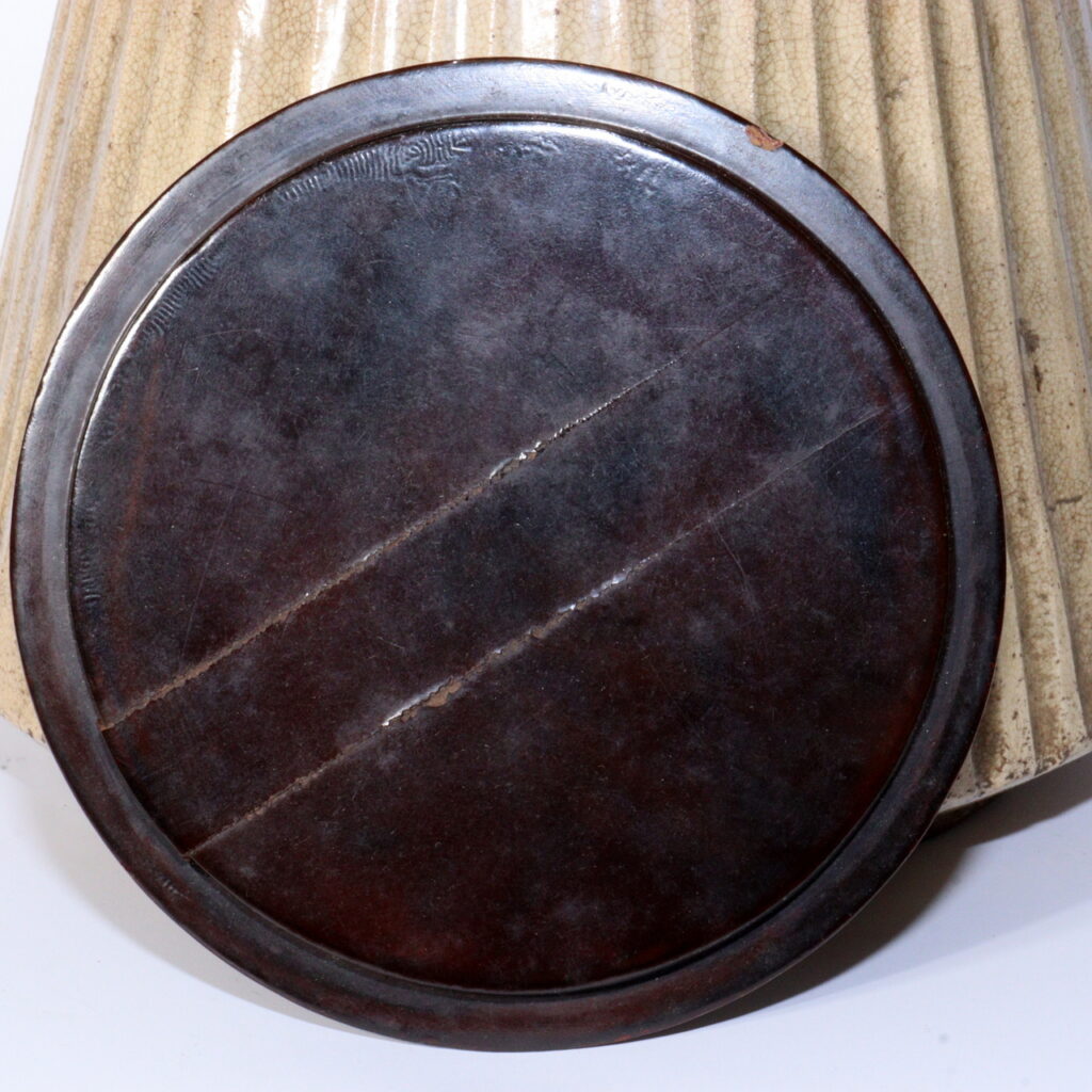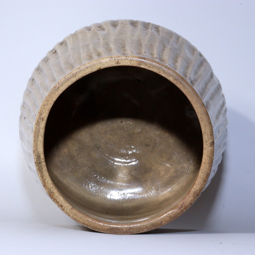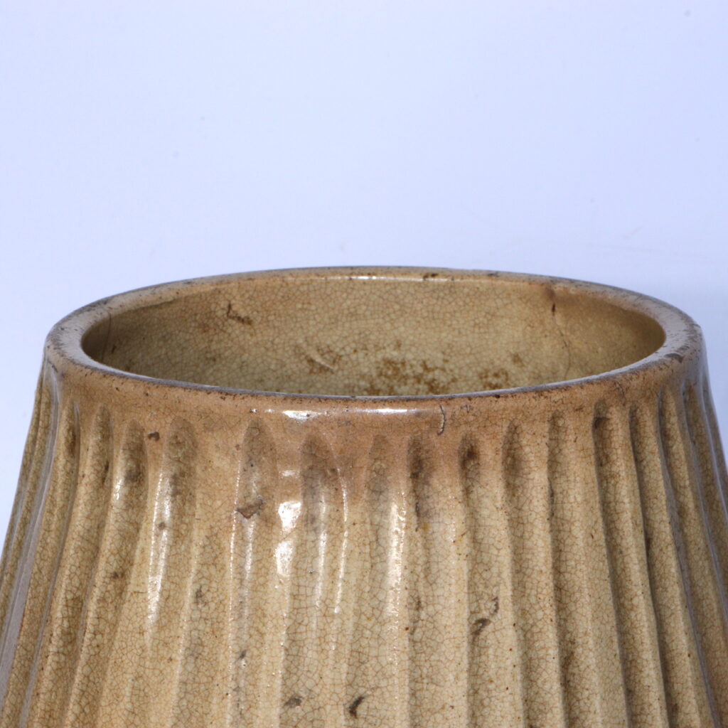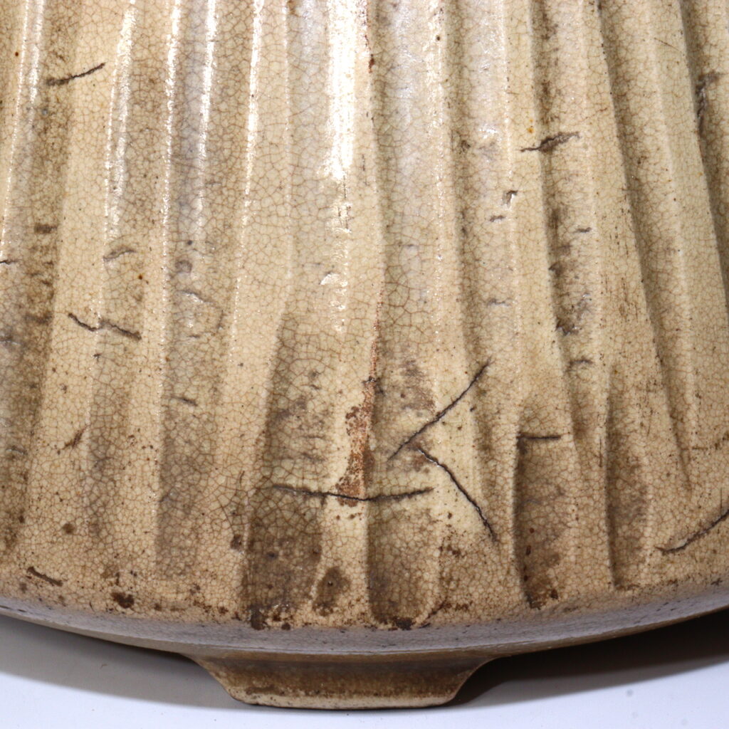 This Antique Kizeto (Ko-Seto) Mizusashi is a refined artifact of Japanese tea culture, uniting functional design with the serene beauty of Kizeto ware. With its ridged carving, warm glaze, and original cedar box, it stands as a treasured piece for both display and use.