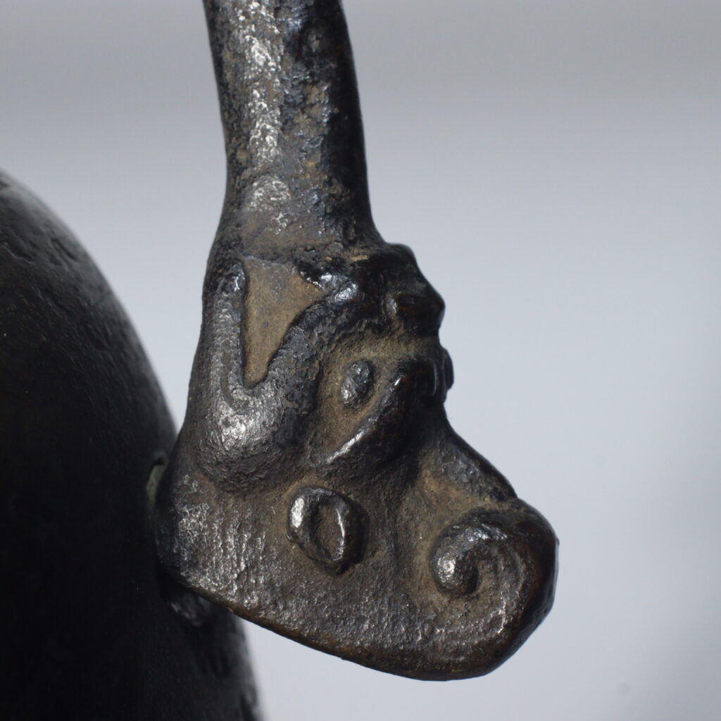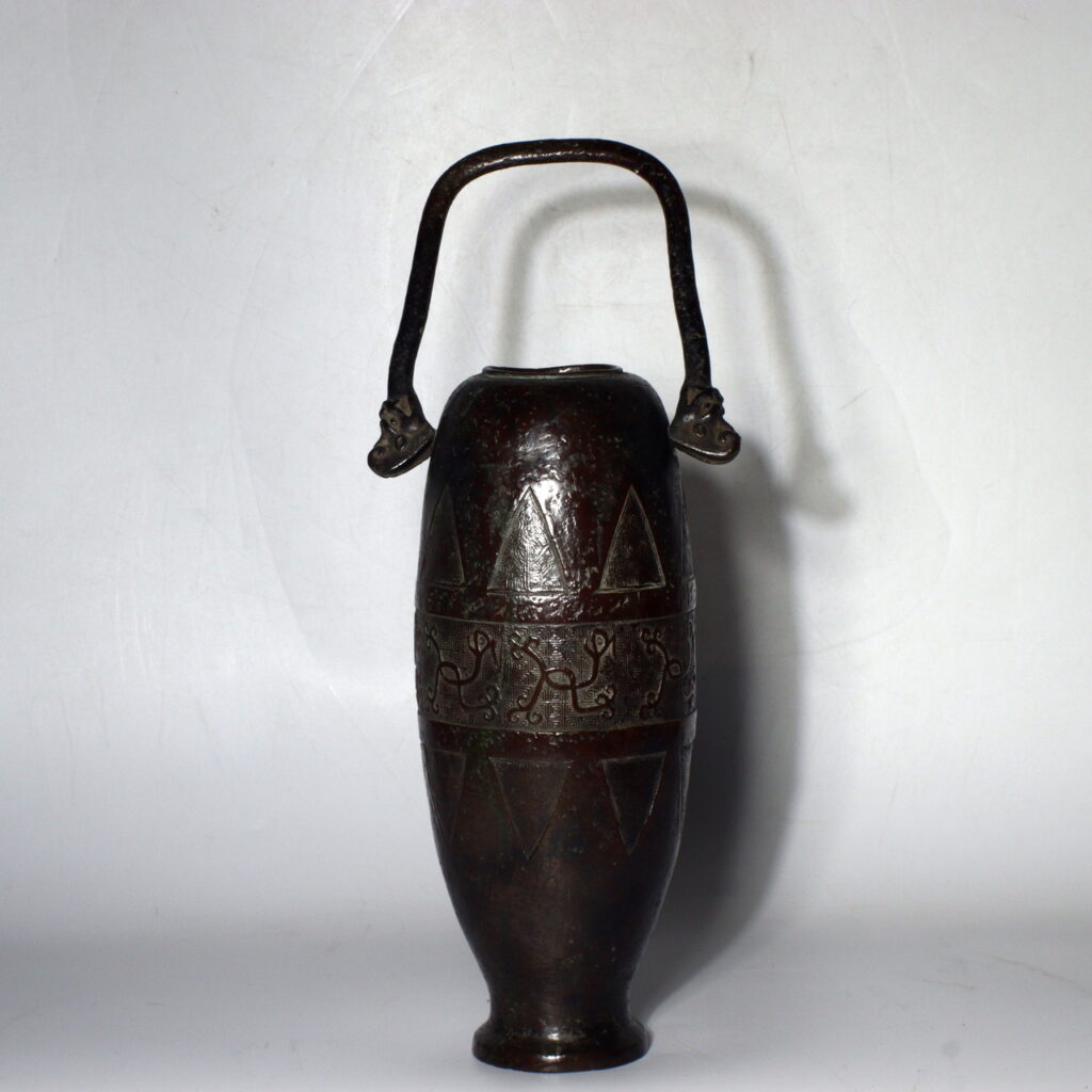 Cast in solid bronze, this vase showcases a masterful control of both material and design. Its tall, elongated body is balanced by a wide, rounded shoulder and a handle adorned with animal-head terminals, a motif reminiscent of ancient ritual ewers.