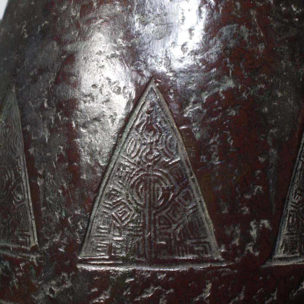 The surface is alive with fine engraving—each triangle filled with intricate linework, each meander meticulously incised. These patterns reflect the artisan’s deep understanding of proportion and rhythm. The alternating texture of raised relief and engraved recess creates a play of light that enhances the vase’s sculptural presence.