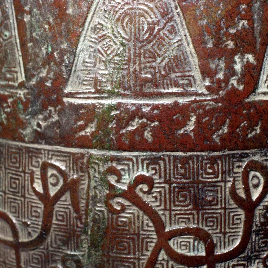 The inclusion of animal forms is especially significant in Chinese symbolism. Each creature embodies different virtues—strength, vitality, intelligence—and serves as a guardian spirit. The vase’s combination of geometric abstraction and zoomorphic imagery reveals a refined synthesis of form, symbolism, and philosophy, echoing the spiritual depth of classical bronze art.