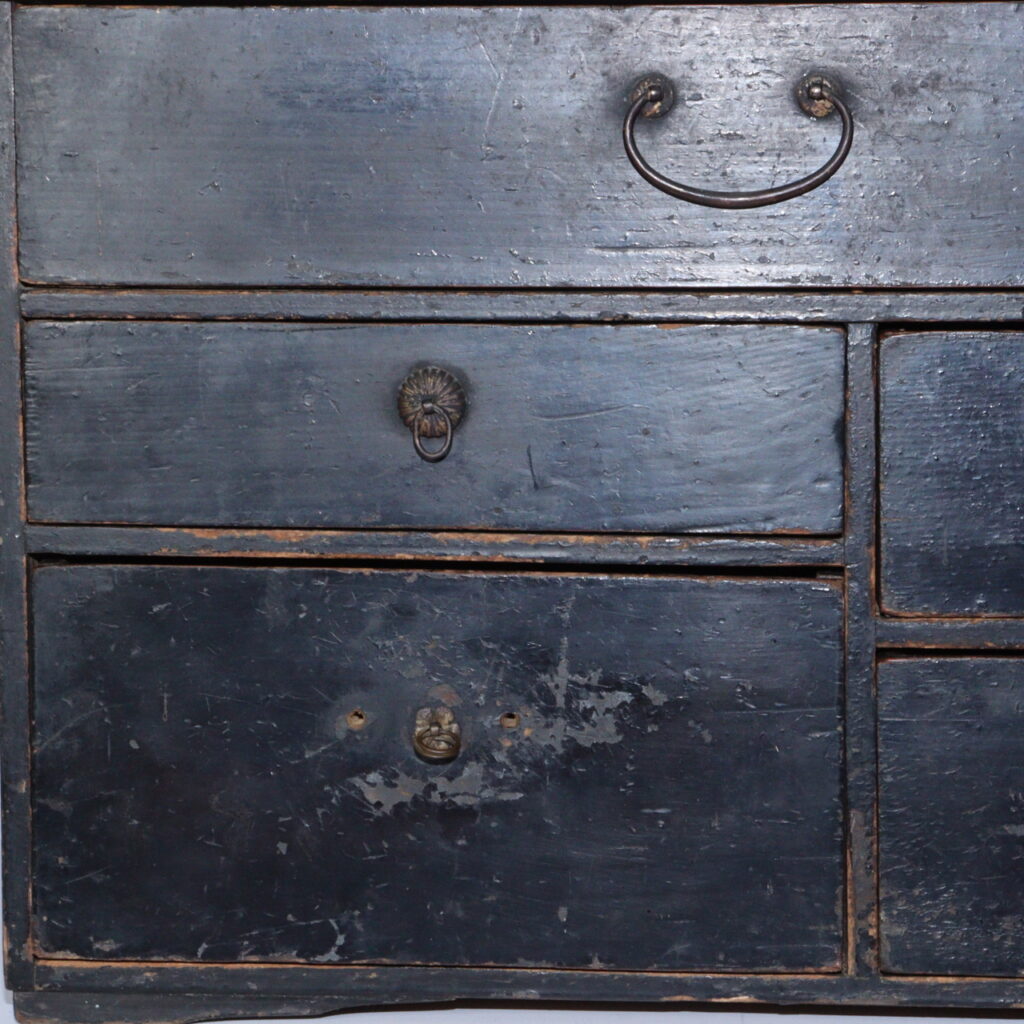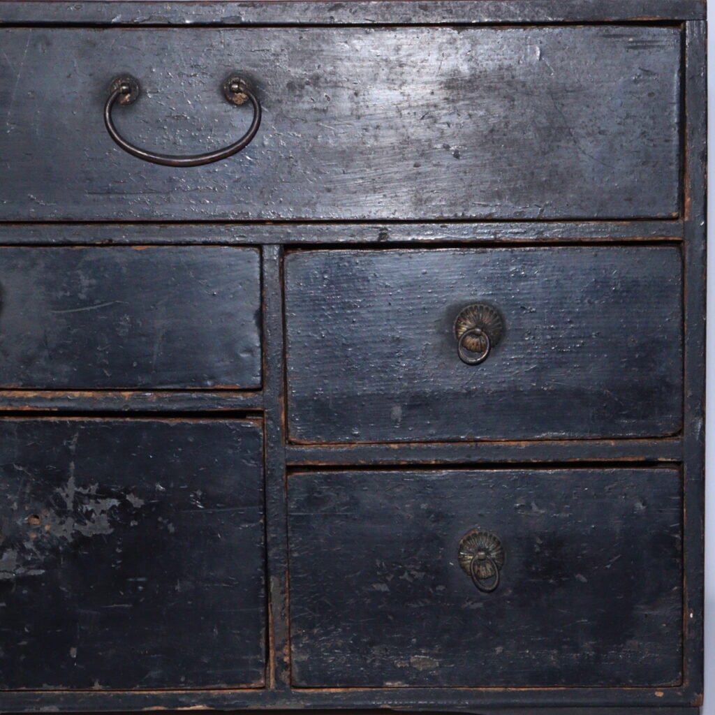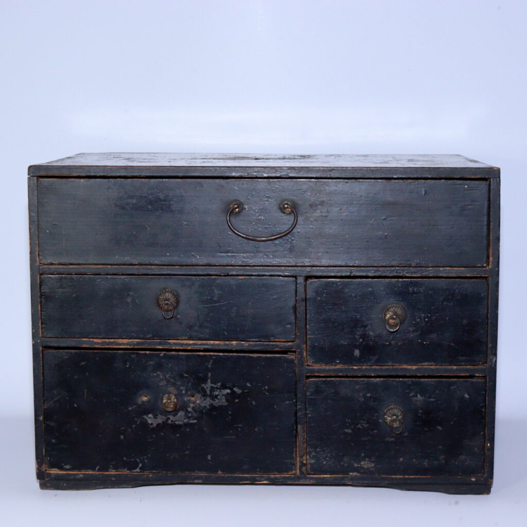 In the quiet beauty of Japanese antiques, few objects tell the story of everyday life as eloquently as a Tansu, or traditional chest of drawers. This small Edo-period Tansu, finished in black lacquer and softened by centuries of use, stands as a modest yet powerful symbol of Japan’s refined sense of form and function.
