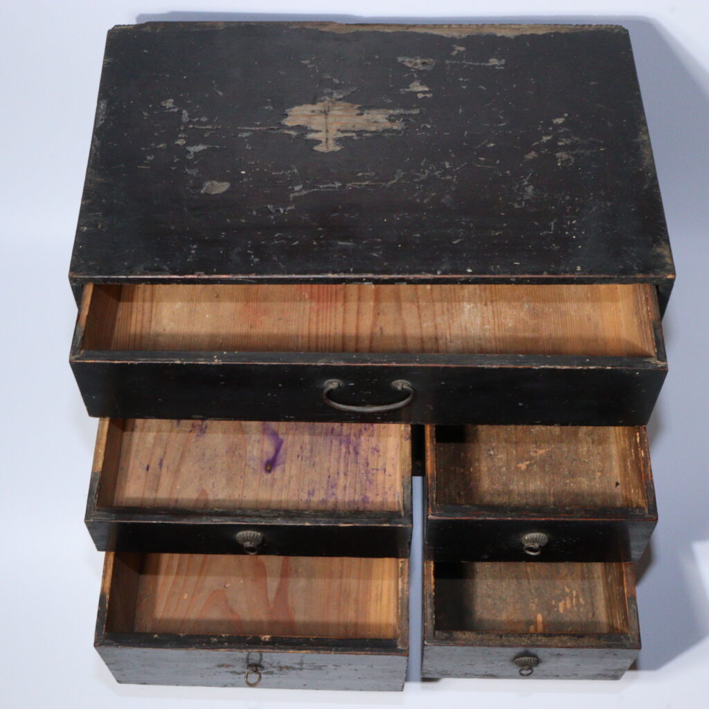 This small wooden chest of drawers, or ko-tansu, would have belonged to a merchant or a samurai household, serving as a storage box for documents, accessories, or writing implements.