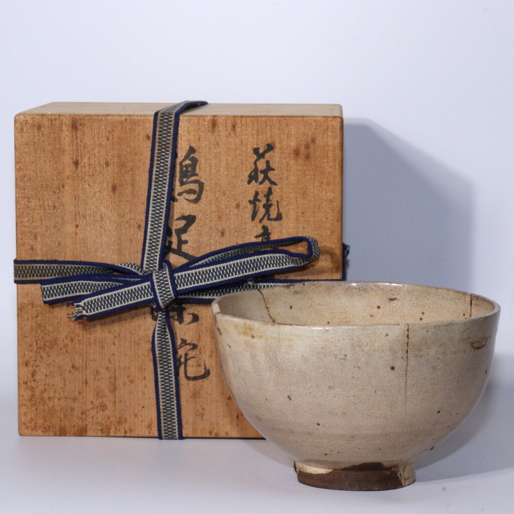 The box bears the bold inscription “Hagi-yaki Kōrai-cha” and “Keisoku Chawan”—literally, “Hagi ware, Korean-style tea bowl, Chicken-foot base.” This term refers to the distinctive wari-kodai, or “split foot” design, which gives the bowl its characteristic tripod-like stance, recalling both Korean Buncheong ware and Japanese rustic sensibilities.