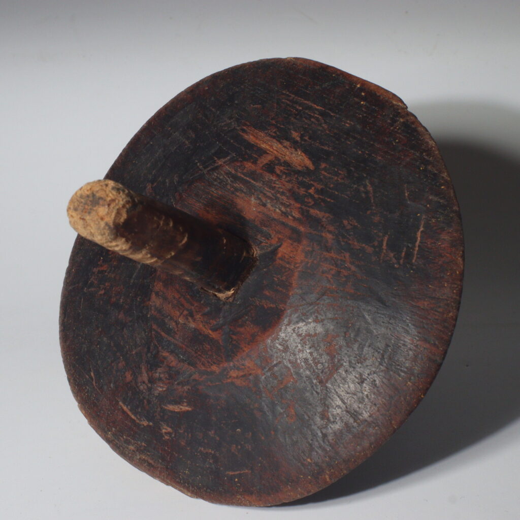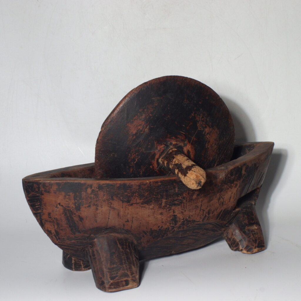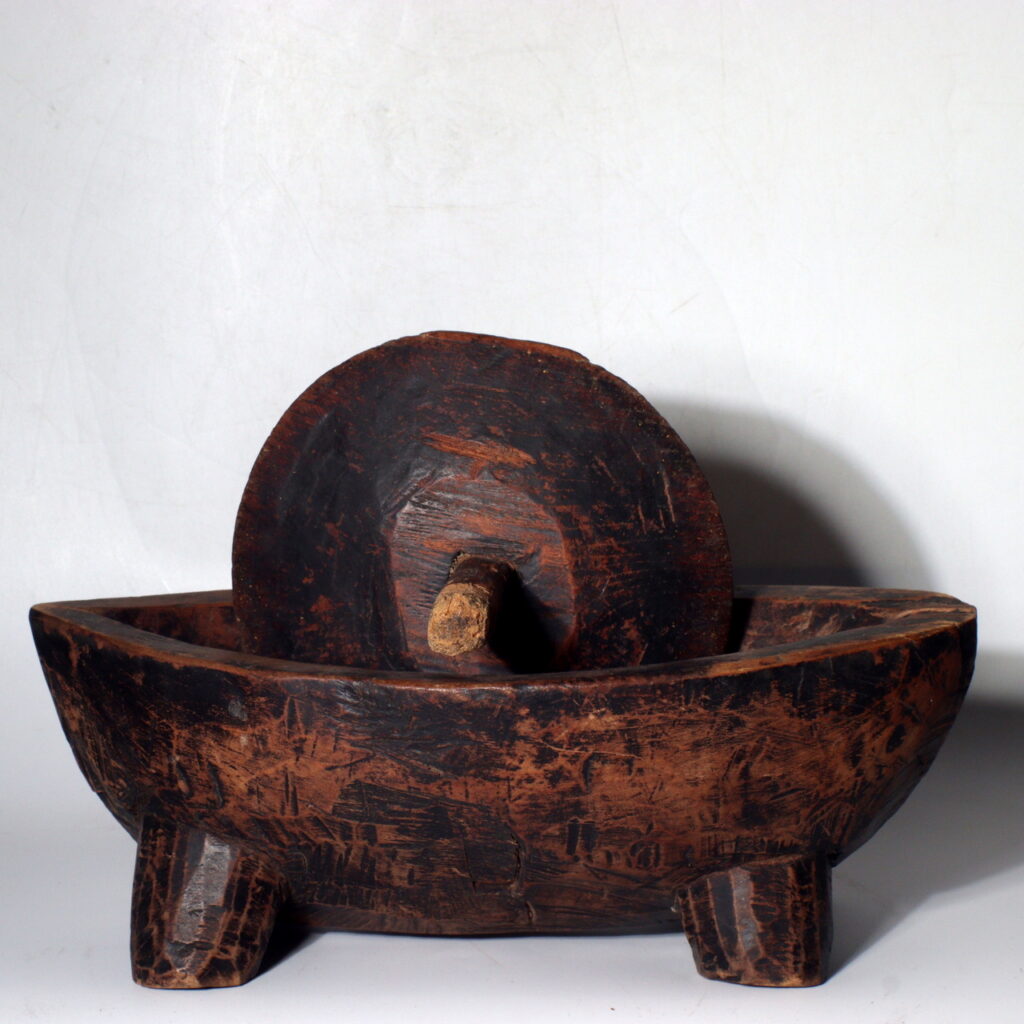 This particular wooden Yagen is a striking example of functional folk art. Hand-carved from solid wood, it reveals the maker’s sensitivity to form and balance. The basin rests on four sturdy legs, giving it stability during use, while the grinding wheel and handle—both worn from repeated motion—display a patina of deep browns and soft polish that only time can produce.