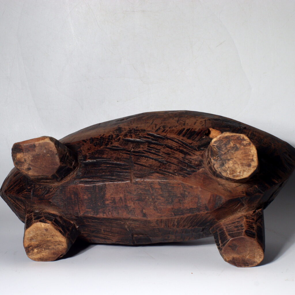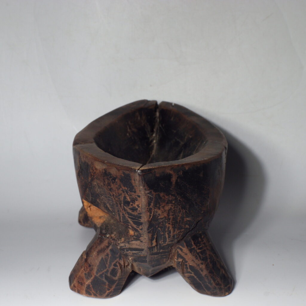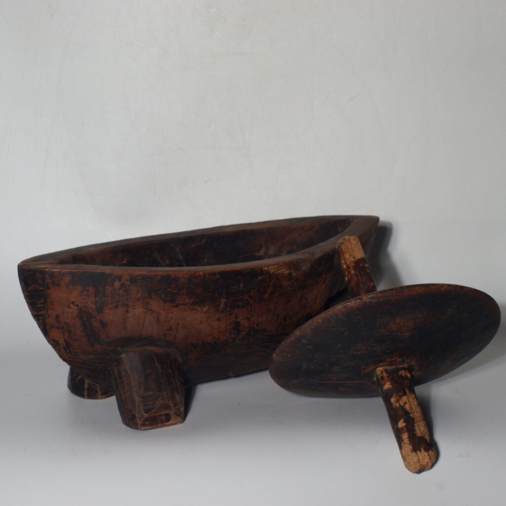 This particular wooden Yagen is a striking example of functional folk art. Hand-carved from solid wood, it reveals the maker’s sensitivity to form and balance. The basin rests on four sturdy legs, giving it stability during use, while the grinding wheel and handle—both worn from repeated motion—display a patina of deep browns and soft polish that only time can produce.