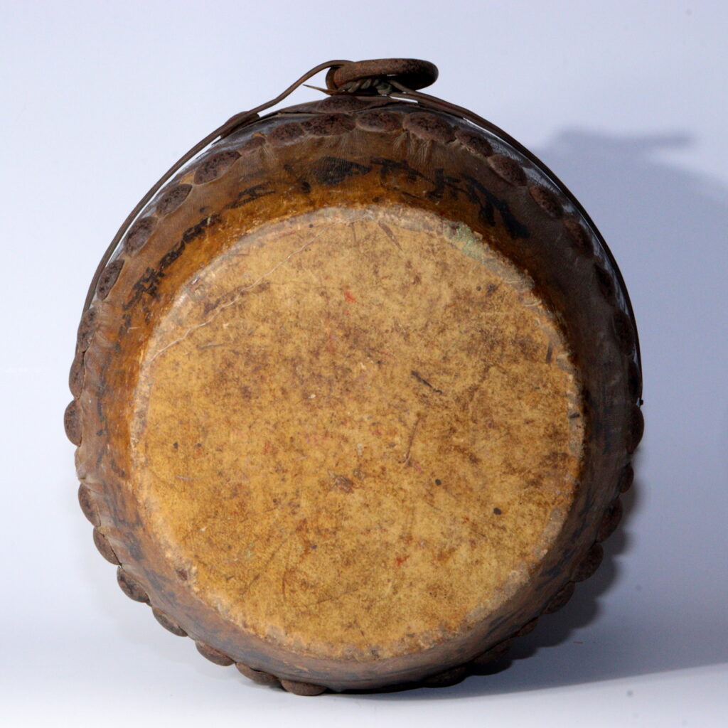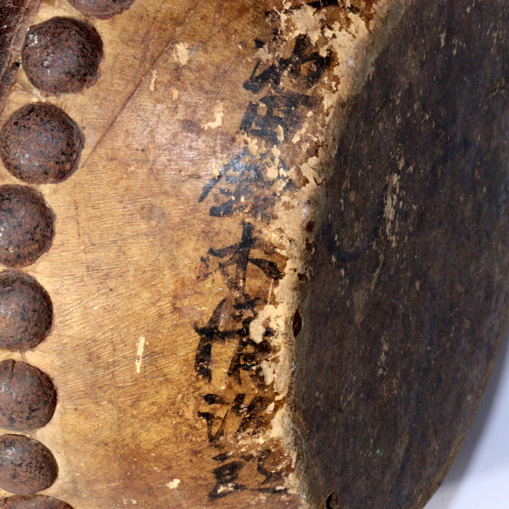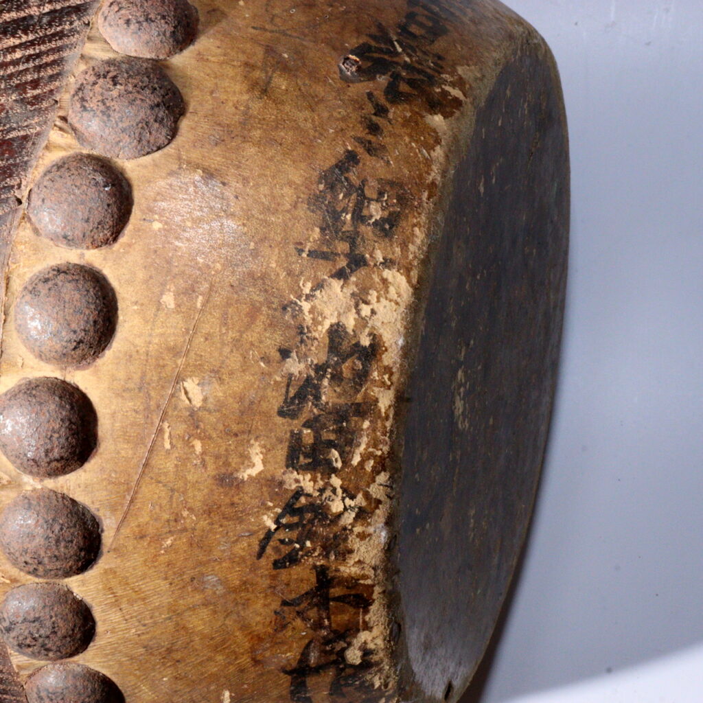 Though the condition remains sound and the drum can still be played, its historical inscription and aged hide recommend it primarily as a display piece: an artifact whose visual presence evokes procession, chant, and lantern-lit nights.