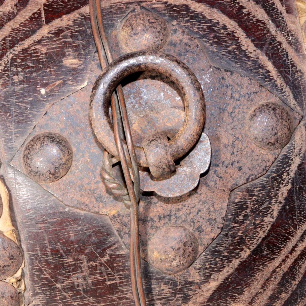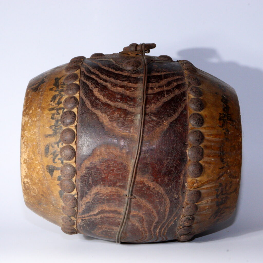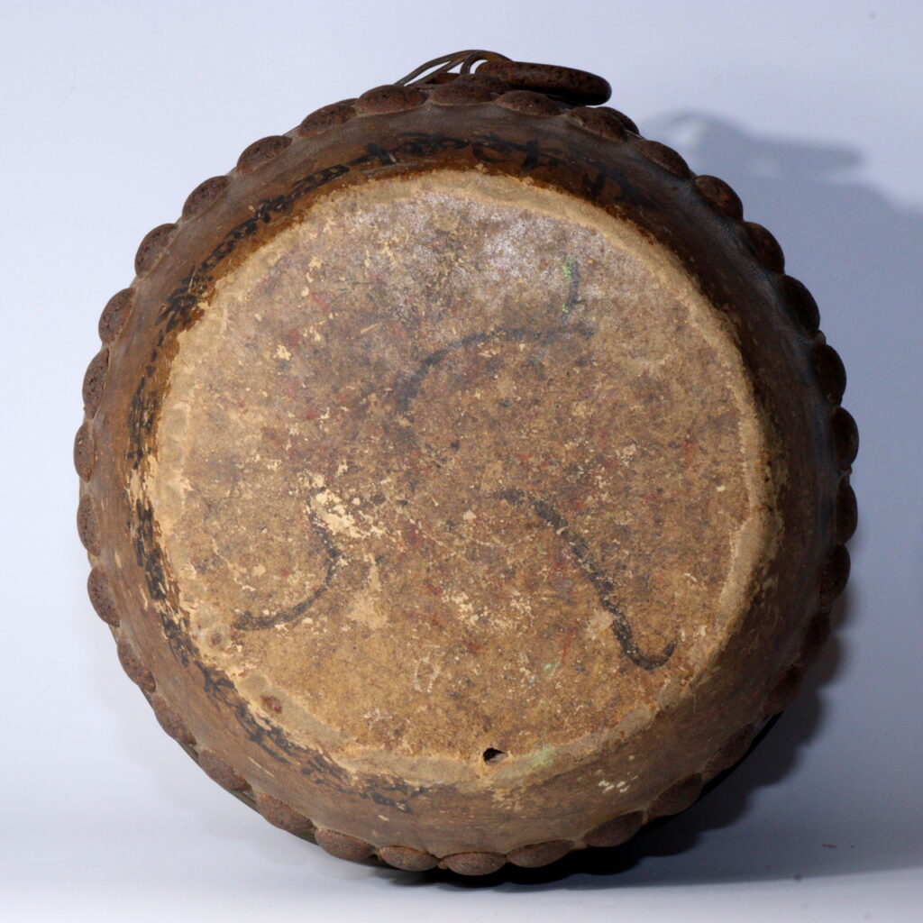 Carved from a solid wooden body and laced with hand-tacked rawhide heads, the drum shows the quiet authority of traditional craftsmanship. Rows of iron studs ring the shell; the surface bears the patina of handling, storage, and seasonal use—subtle gloss on the wood, rich ambering on the hide, and honest wear that collectors prize as wabi-sabi.