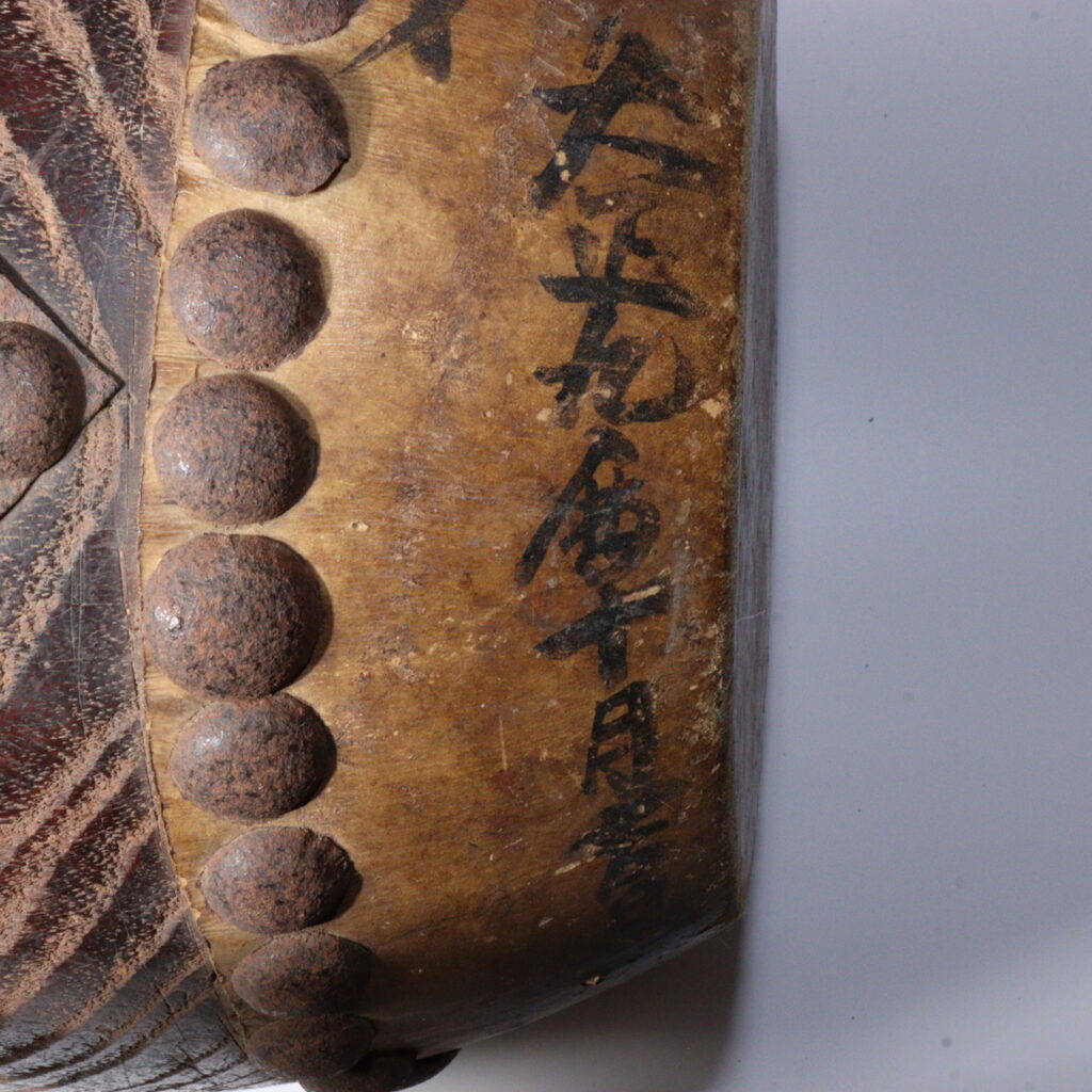 This drum dates to Taishō 9 (October, 1920)—its ink inscription confirms the moment. The Taishō period (1912–1926) bridged Meiji modernization and early Shōwa, and local shrines remained anchors of tradition. In Kyushu, where sea routes brought diverse influences yet preserved strong Shintō customs, drums like this marked sacred time: the opening of a rite, the turning of a dance, the safe return of a portable shrine (mikoshi).