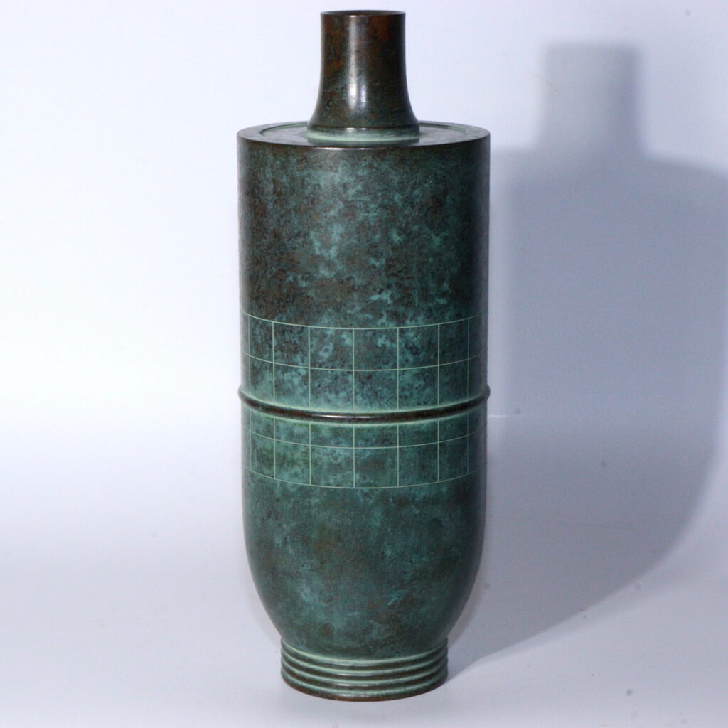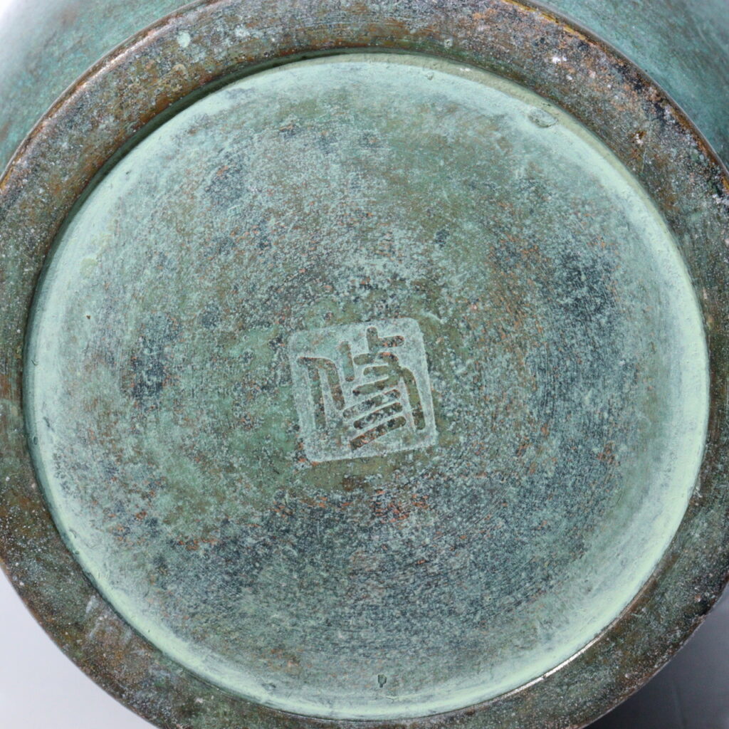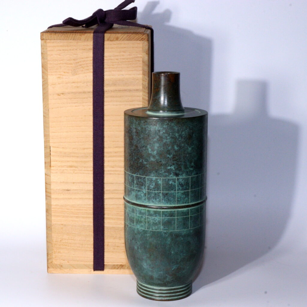 This vase exemplifies Hasuda’s mastery: the rich green patina evokes centuries-old bronze traditions, while the refined cylindrical form and grid-like engraving reveal a modernist sensibility. The result is an object that bridges past and present—equally at home in a Japanese tea alcove or a contemporary art collection.