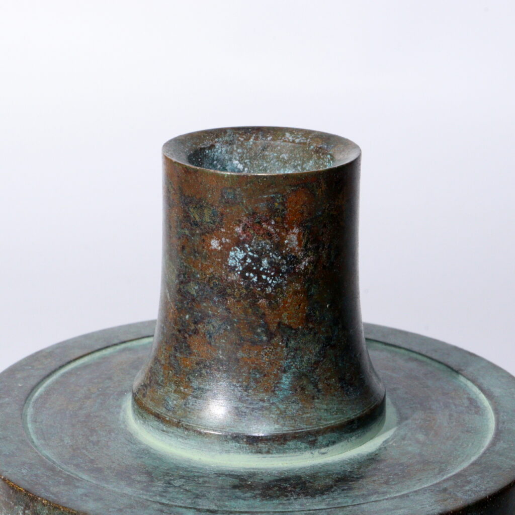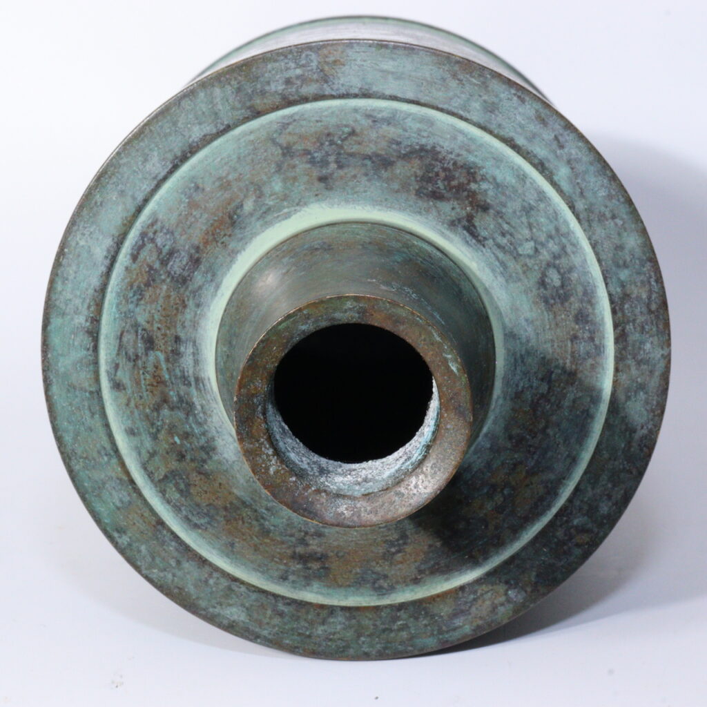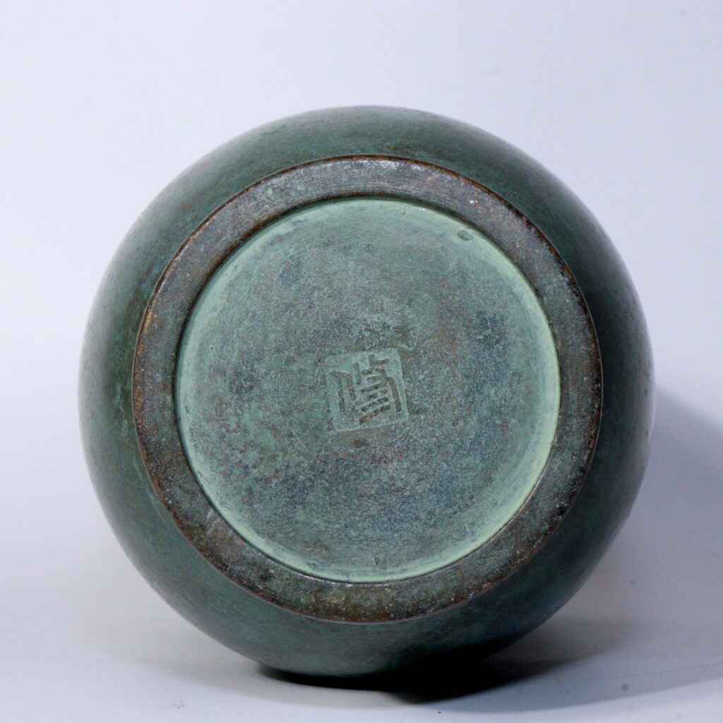 This vase exemplifies Hasuda’s mastery: the rich green patina evokes centuries-old bronze traditions, while the refined cylindrical form and grid-like engraving reveal a modernist sensibility. The result is an object that bridges past and present—equally at home in a Japanese tea alcove or a contemporary art collection.