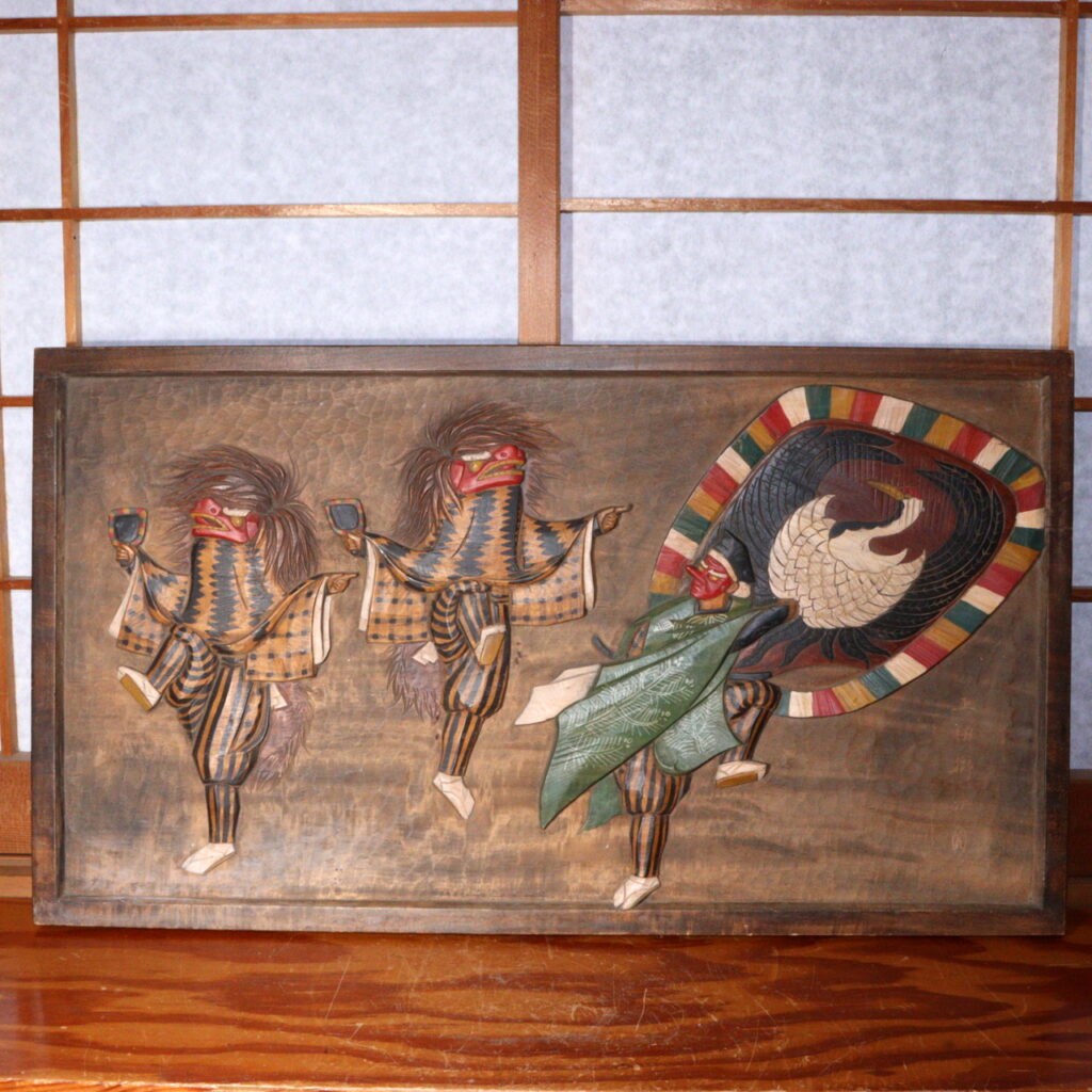 Among the many treasures of Japanese antiques, few capture the vigor and joy of local culture as vividly as the Ueda Shishi (Lion Dance) carvings. This exceptional wooden wall hanging, meticulously sculpted by a skilled craftsman, embodies the powerful rhythm and grace of the lion dancers (shishimai) from Japan’s traditional performing arts.