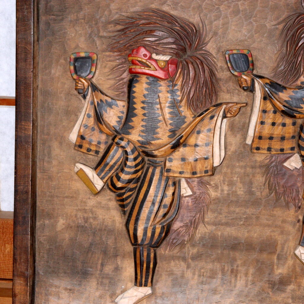 This wall carving depicts the Ueda-style lion dancers alongside a majestic eagle — a symbol of courage and divine power. The combination of these two creatures evokes both movement and protection, portraying a vivid moment of cultural vitality.