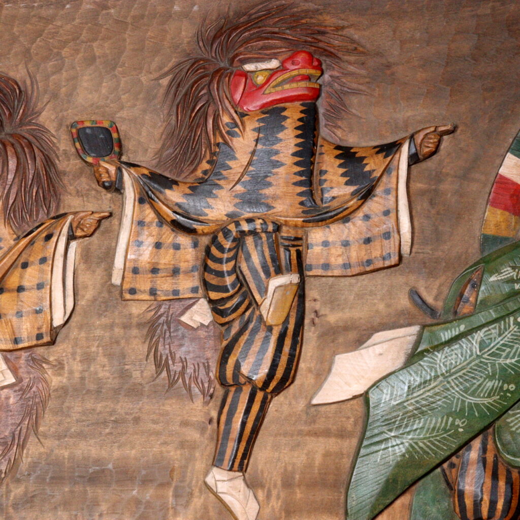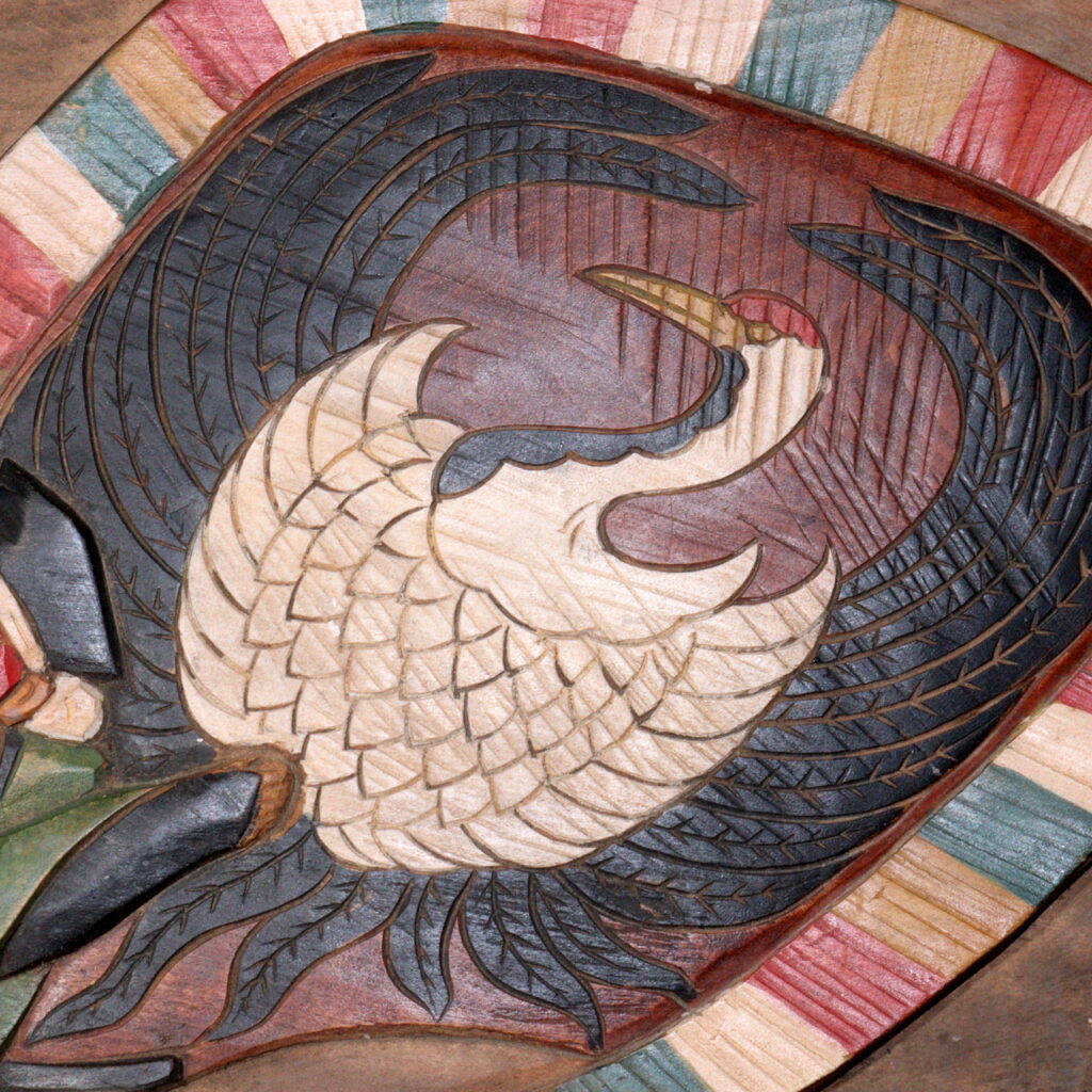 The artisan’s chisel marks breathe life into every fold of the dancers’ robes and the feathers of the soaring eagle, creating a dynamic composition that seems almost in motion.