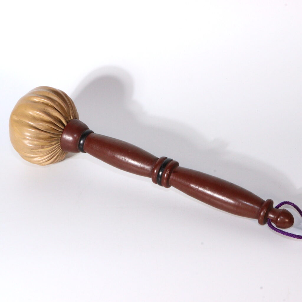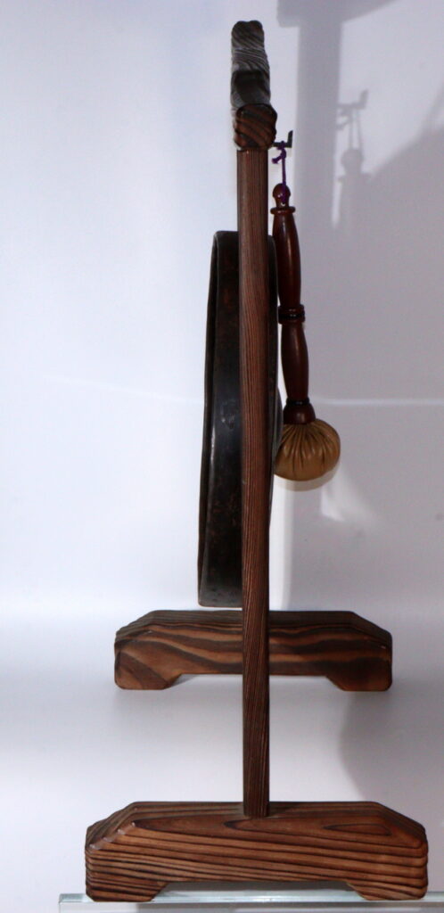 Beside the gong hangs a mallet with a padded silk head, symbolizing gentleness in the act of sound creation. The careful balance of wood, metal, and fabric transforms this piece into a complete work of functional art, uniting materials and intention in a meditative harmony.