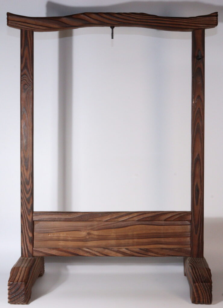 The gong is suspended by a woven cord from a robust wooden frame crafted in natural grain cedar or pine, designed not only for strength but also for beauty. The frame’s flowing lines and sturdy base reflect the Japanese aesthetic of wabi-sabi—the acceptance of transience and the beauty of imperfection.