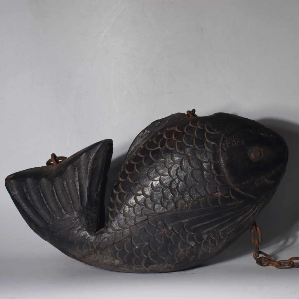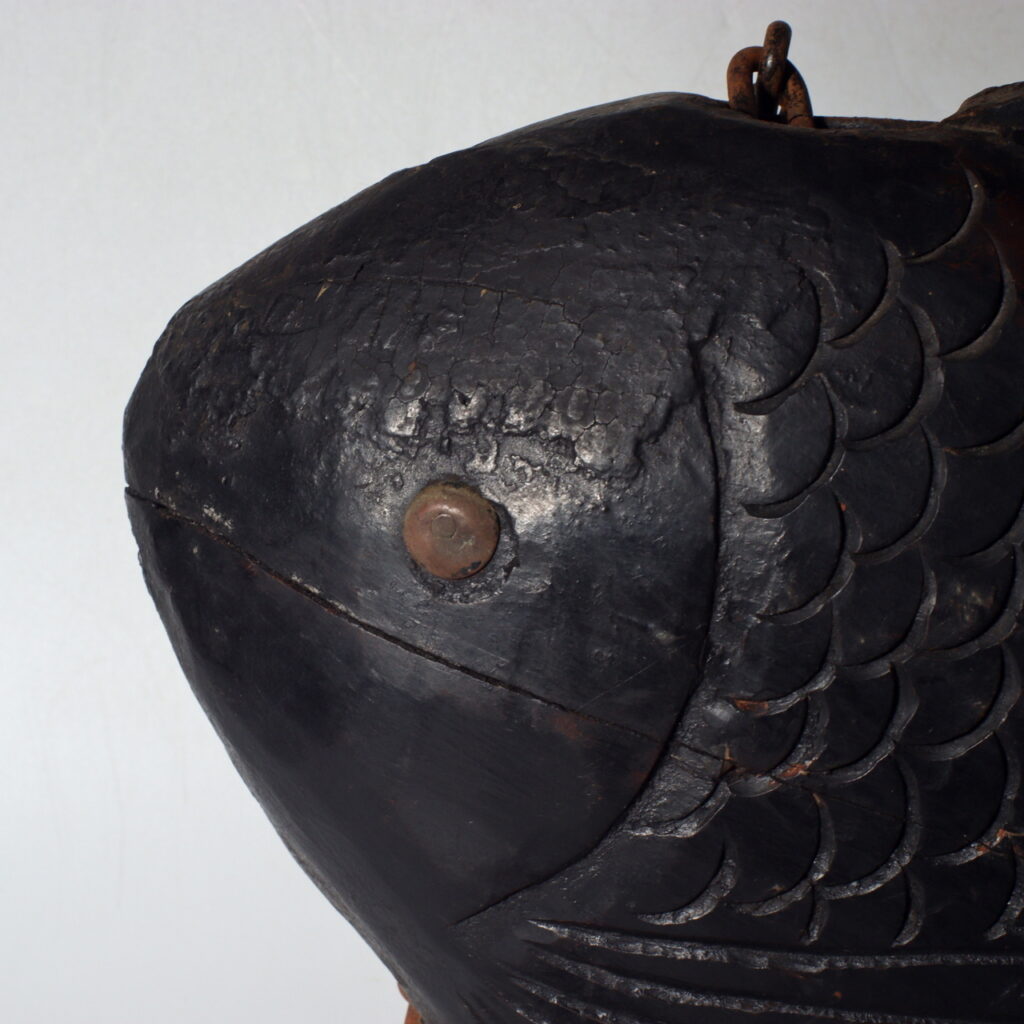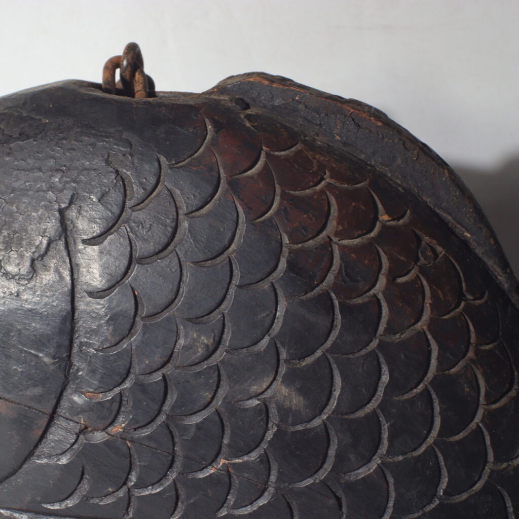 This antique wooden sea bream Jizai Kagi displays the meticulous artistry typical of the Meiji era (circa late 19th to early 20th century). The form captures the lively curve of the fish’s body — full, rounded, and graceful. Each scale is individually carved in relief, showing both precision and rhythm, while the fins and tail are shaped with elegant linear depth.