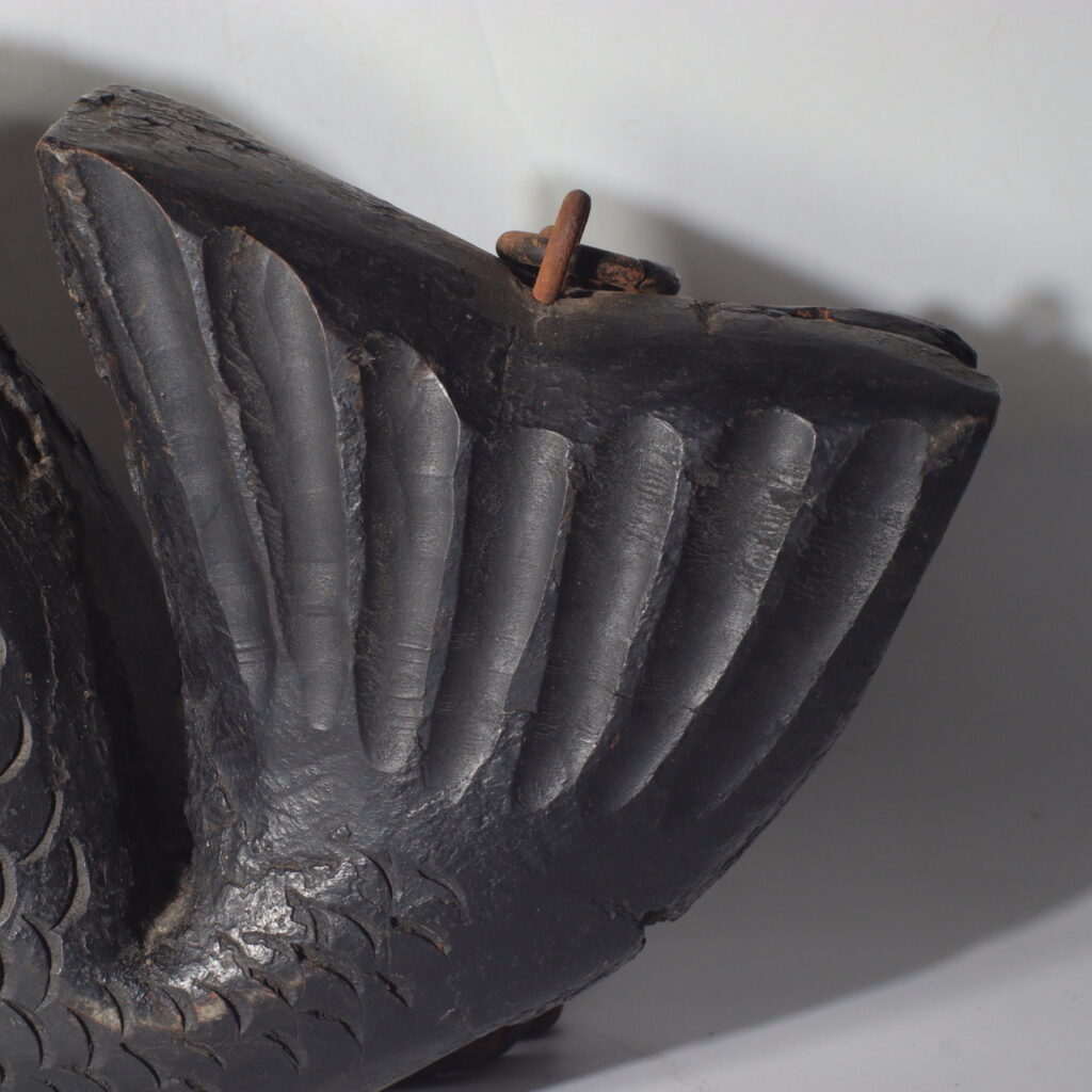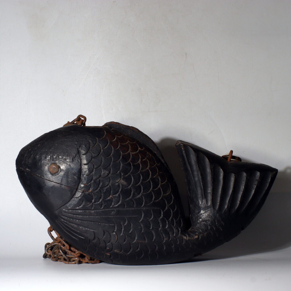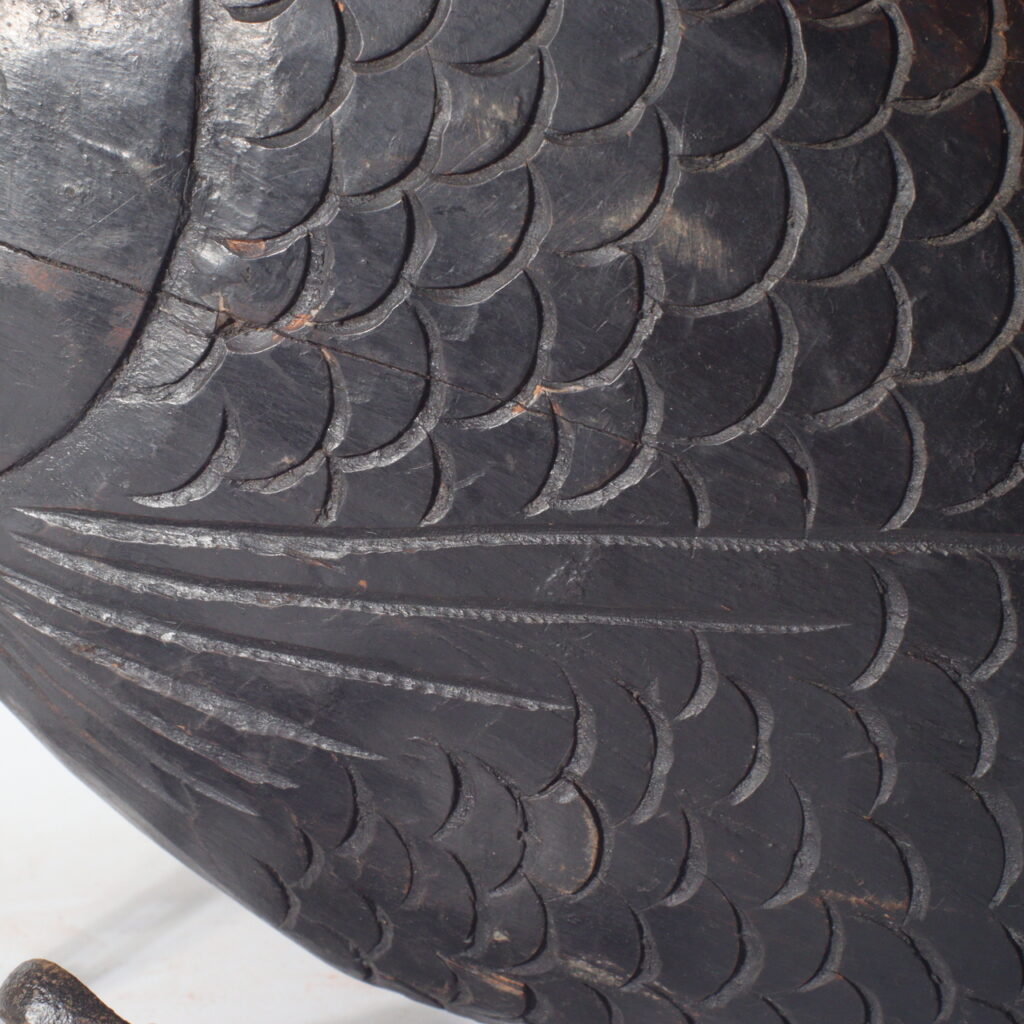 This antique wooden sea bream Jizai Kagi displays the meticulous artistry typical of the Meiji era (circa late 19th to early 20th century). The form captures the lively curve of the fish’s body — full, rounded, and graceful. Each scale is individually carved in relief, showing both precision and rhythm, while the fins and tail are shaped with elegant linear depth.