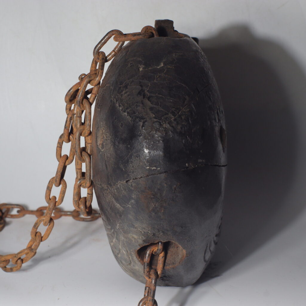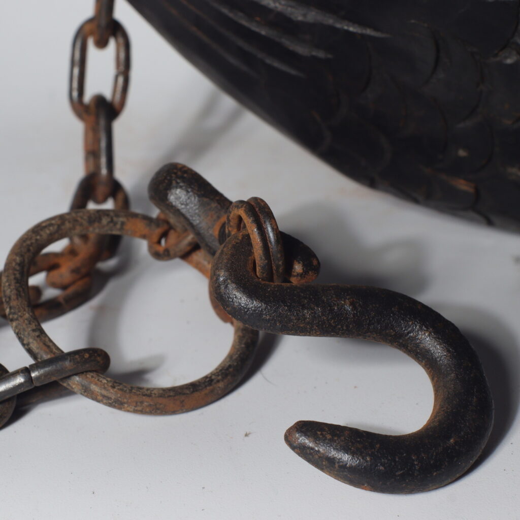 At the lower end, the original iron chain and hook remain intact, showcasing the seamless blend of wood and metal craftsmanship. The hand-forged iron links, with their rustic texture and organic form, harmonize beautifully with the sculpted fish, making the piece both a practical tool and a folk sculpture.