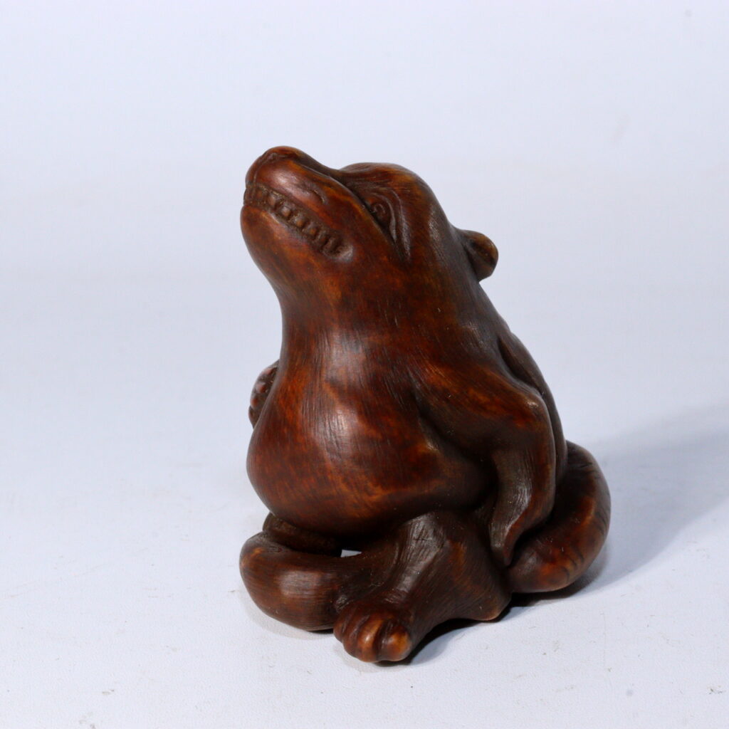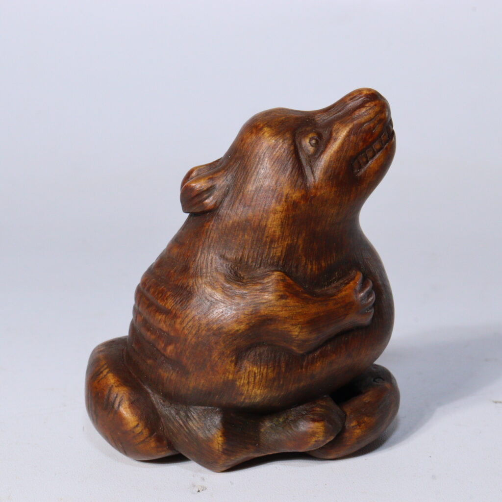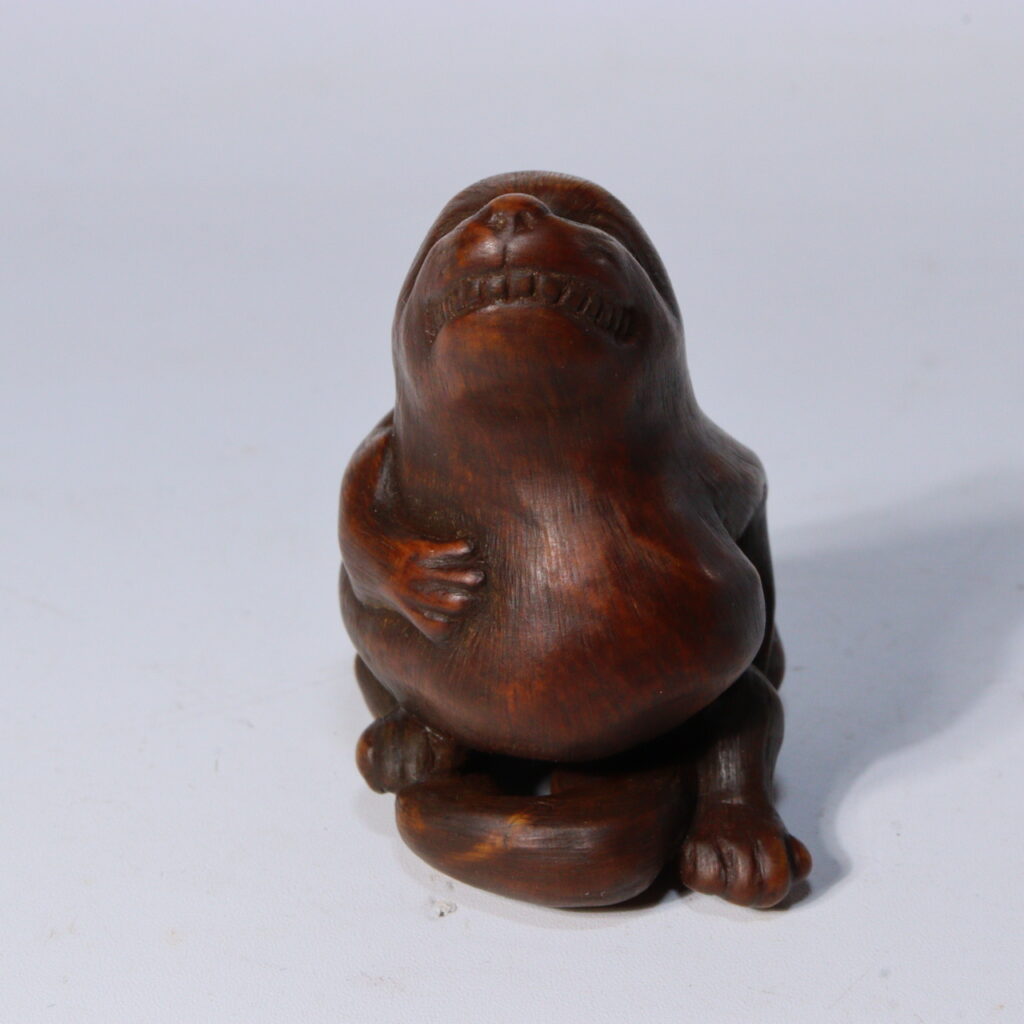 The most striking feature of this netsuke is its dramatic and powerful facial expression. The wide eyes, sharp features, and slightly unsettling grin embody the tanuki’s dual character: mischievous trickster and supernatural being. Unlike the more common animal netsuke, this carving emphasizes psychological presence over realism, making it highly unusual.