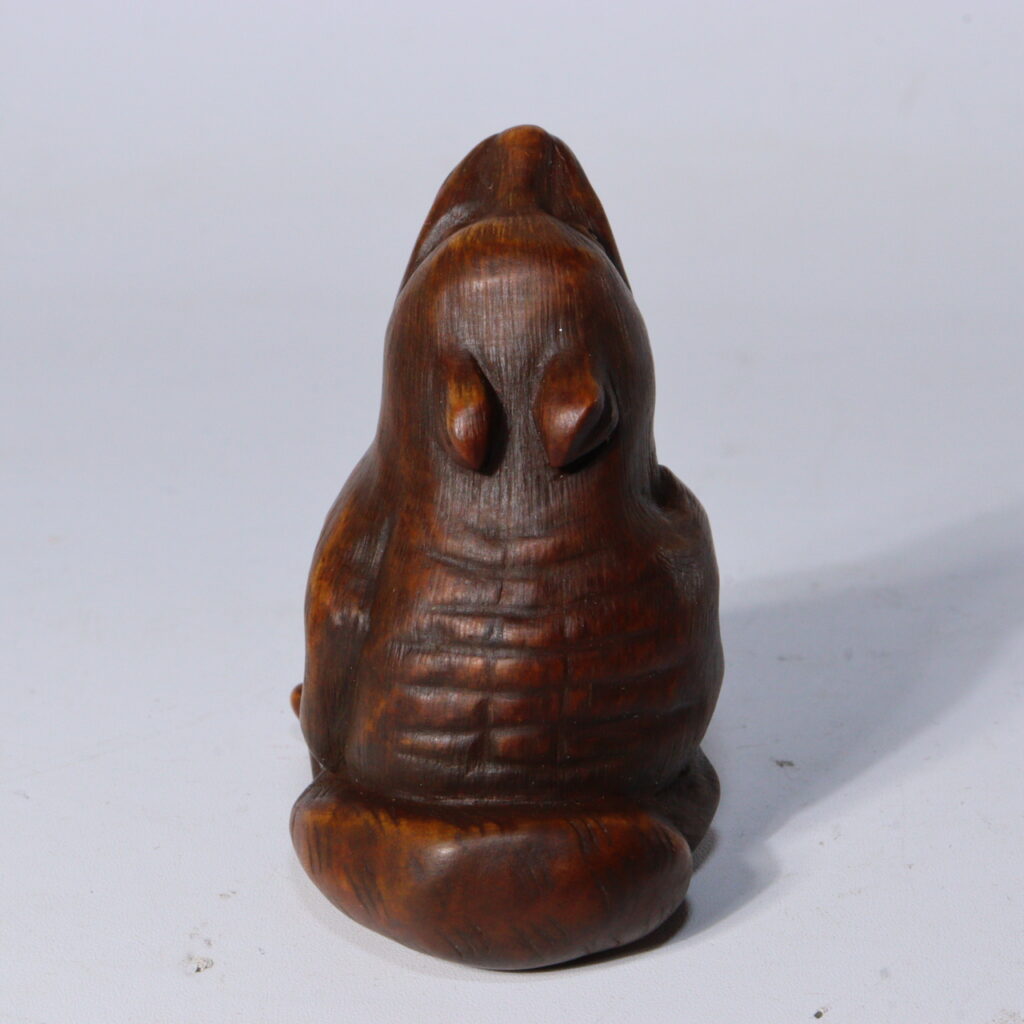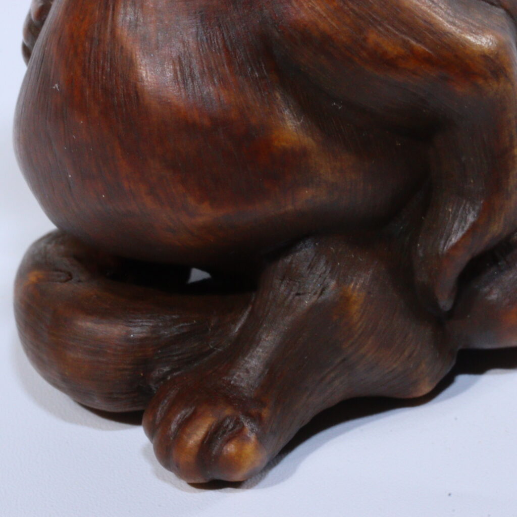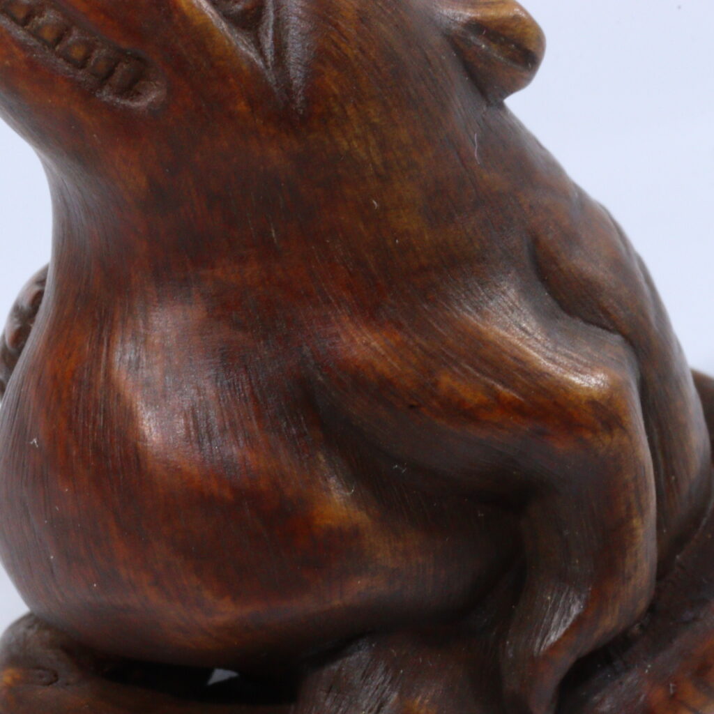 The smooth wooden finish has aged gracefully over time, adding warmth and depth to the piece. Every curve, from the rounded belly to the curled tail, is a testament to the skill of the artisan who worked within the aesthetic traditions of Edo and Meiji craftsmanship.