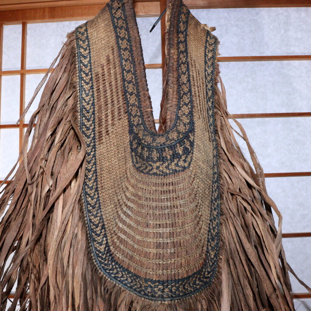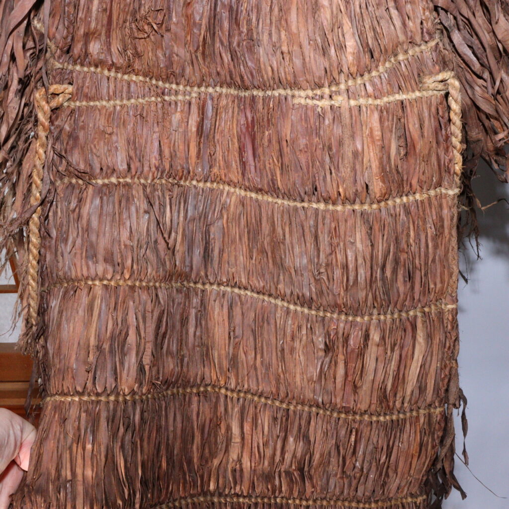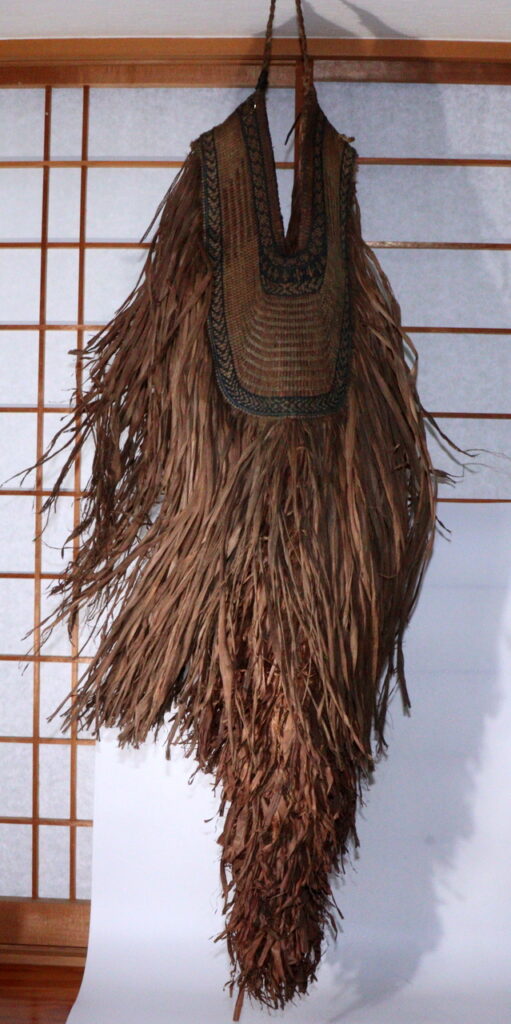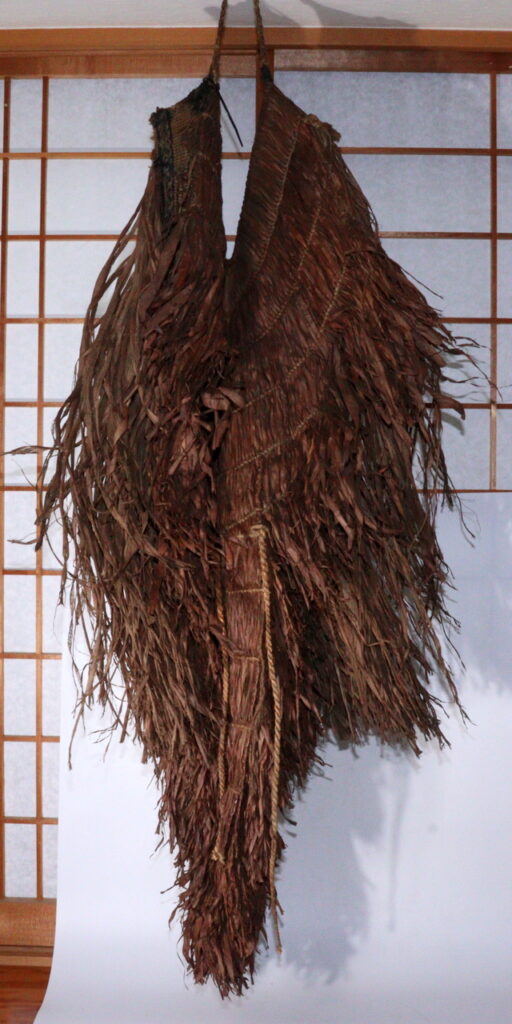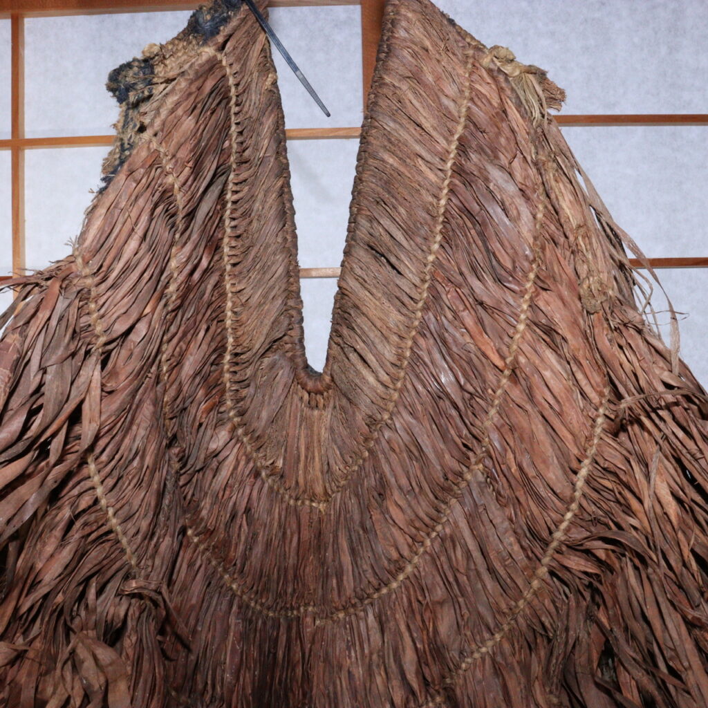 The dense fringe of fibers that cascades downward was designed to channel rain away from the body, functioning like natural thatch. This technique not only reflects environmental adaptation but also resonates with the Japanese aesthetic of wabi-sabi—the beauty of imperfection, transience, and handmade authenticity.