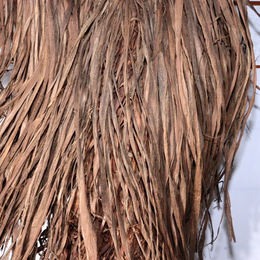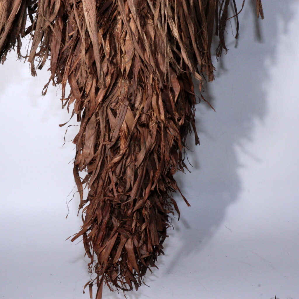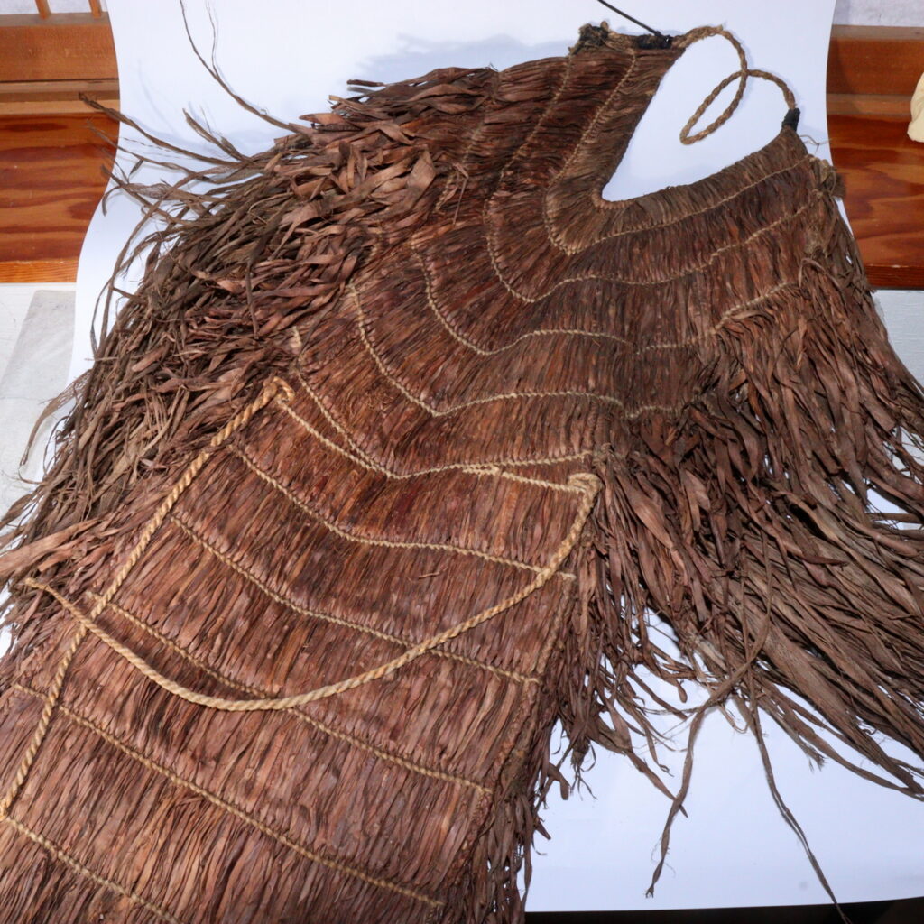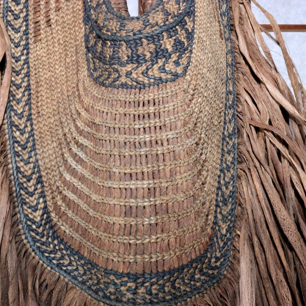 The dense fringe of fibers that cascades downward was designed to channel rain away from the body, functioning like natural thatch. This technique not only reflects environmental adaptation but also resonates with the Japanese aesthetic of wabi-sabi—the beauty of imperfection, transience, and handmade authenticity.