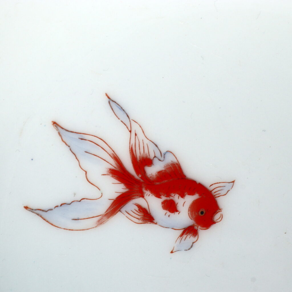 This particular bowl embodies that period’s spirit of creative harmony. The soft square shape, functional handles, and smooth white porcelain surface recall Western dining culture, while the motif of goldfish—a beloved symbol of prosperity, beauty, and grace in Japanese art—anchors it firmly within Japan’s visual tradition.